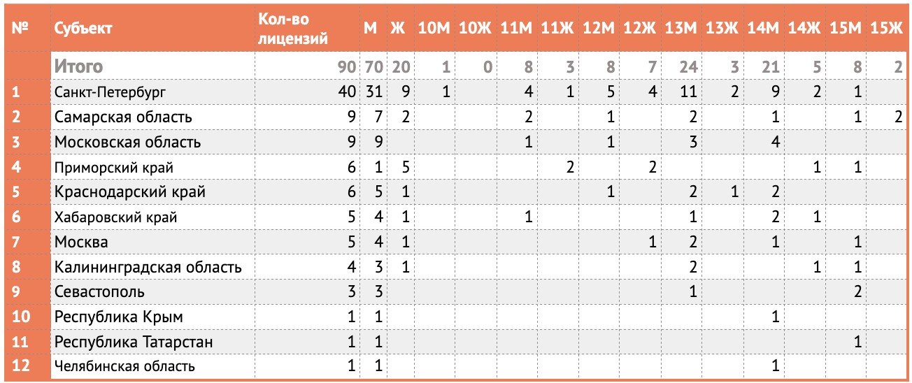 Распределение лицензий среди спортсменов разных регионов и разных возрастов