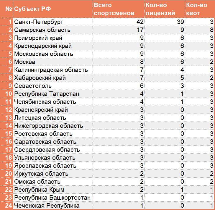 Да, при отборе есть трудности в некоторых регионах, но наша задача — привезти на первенство сильнейших, при этом квоты регионам мы предоставляем. Обратите внимание на статистику, которая приводится далее в этой статье: уровень спортсменов, заявленных по квотам, довольно низкий. Сейчас мы не будем подробно разбирать причины такого положения вещей, это отдельная тема».