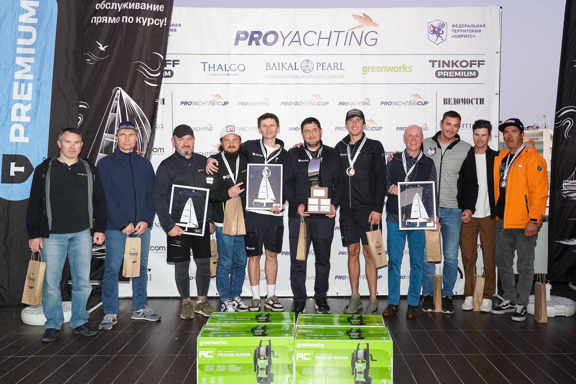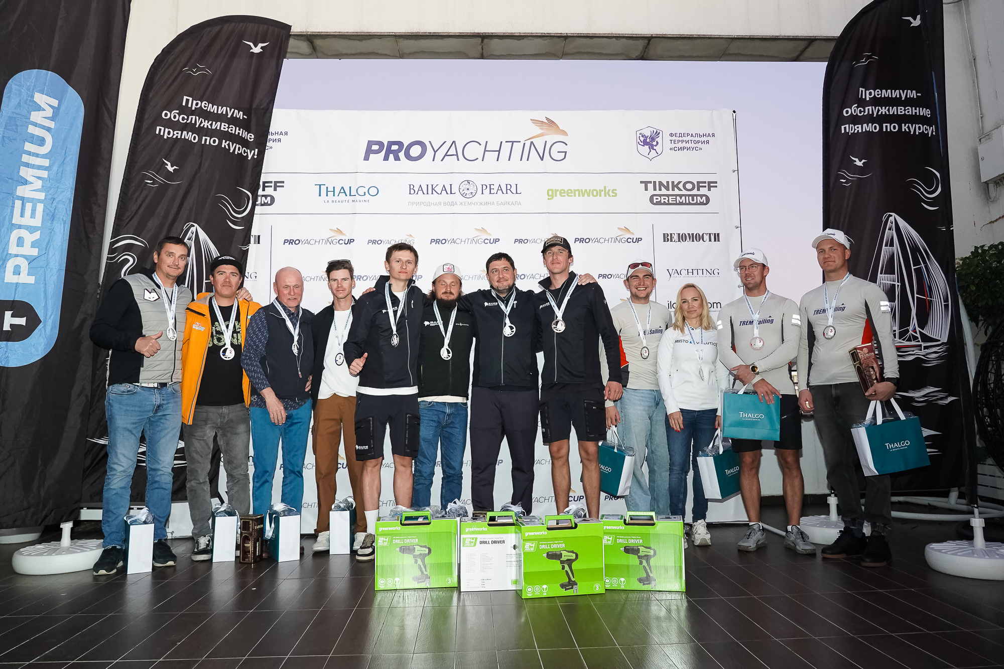 PROyachting Cup поддерживают: Премиум от Т-Банк, питьевая вода «Жемчужина Байкала», косметический бренд Thalgo, компания Greenworks, сеть отелей Sirius Hotels и компания Finist.