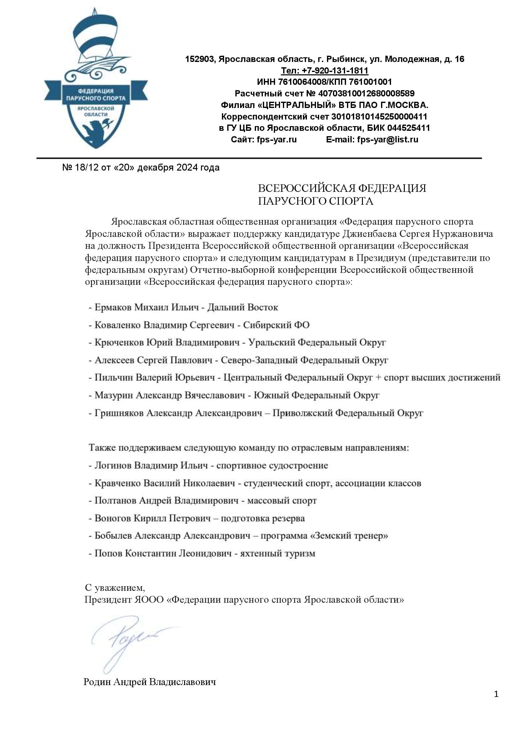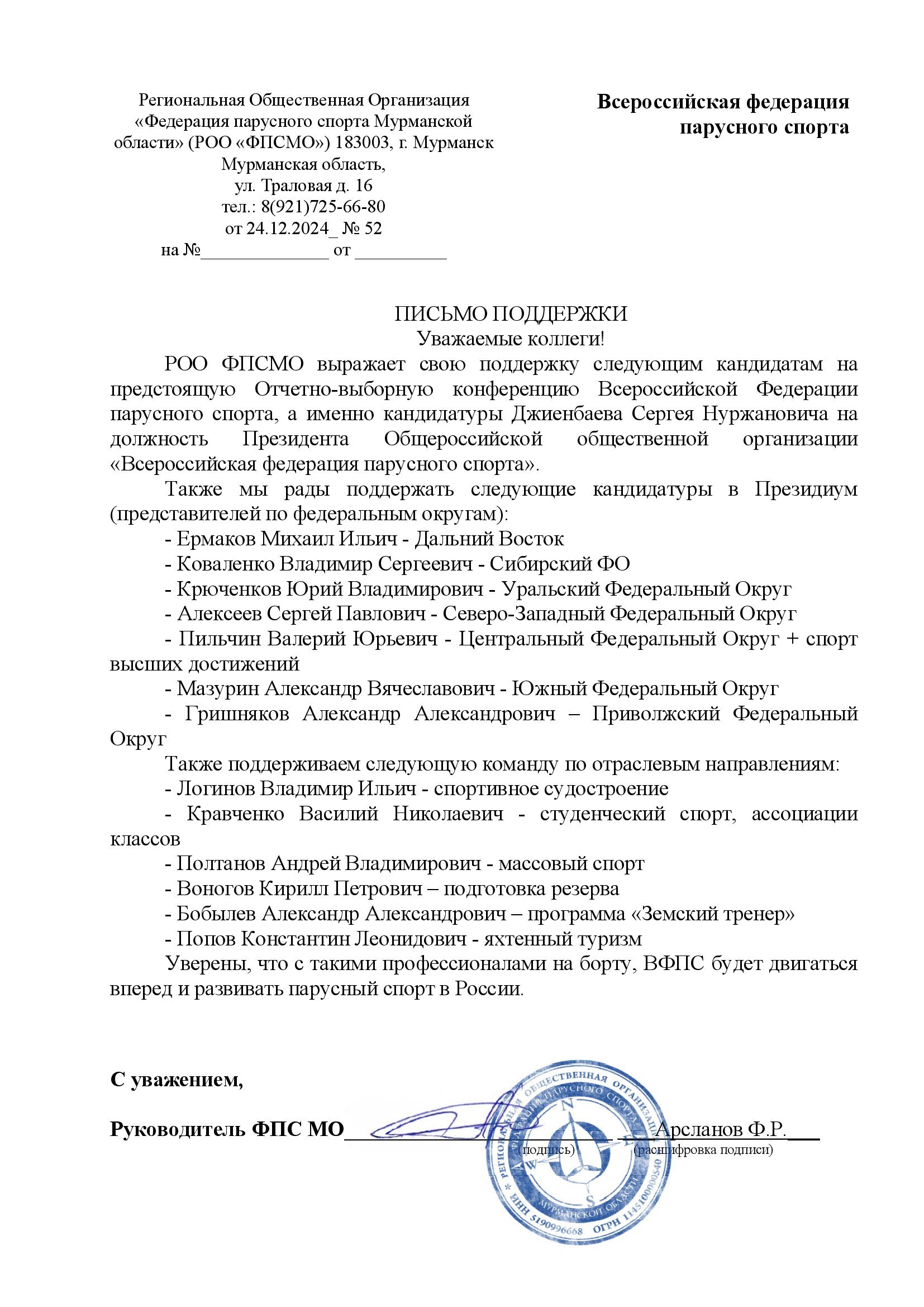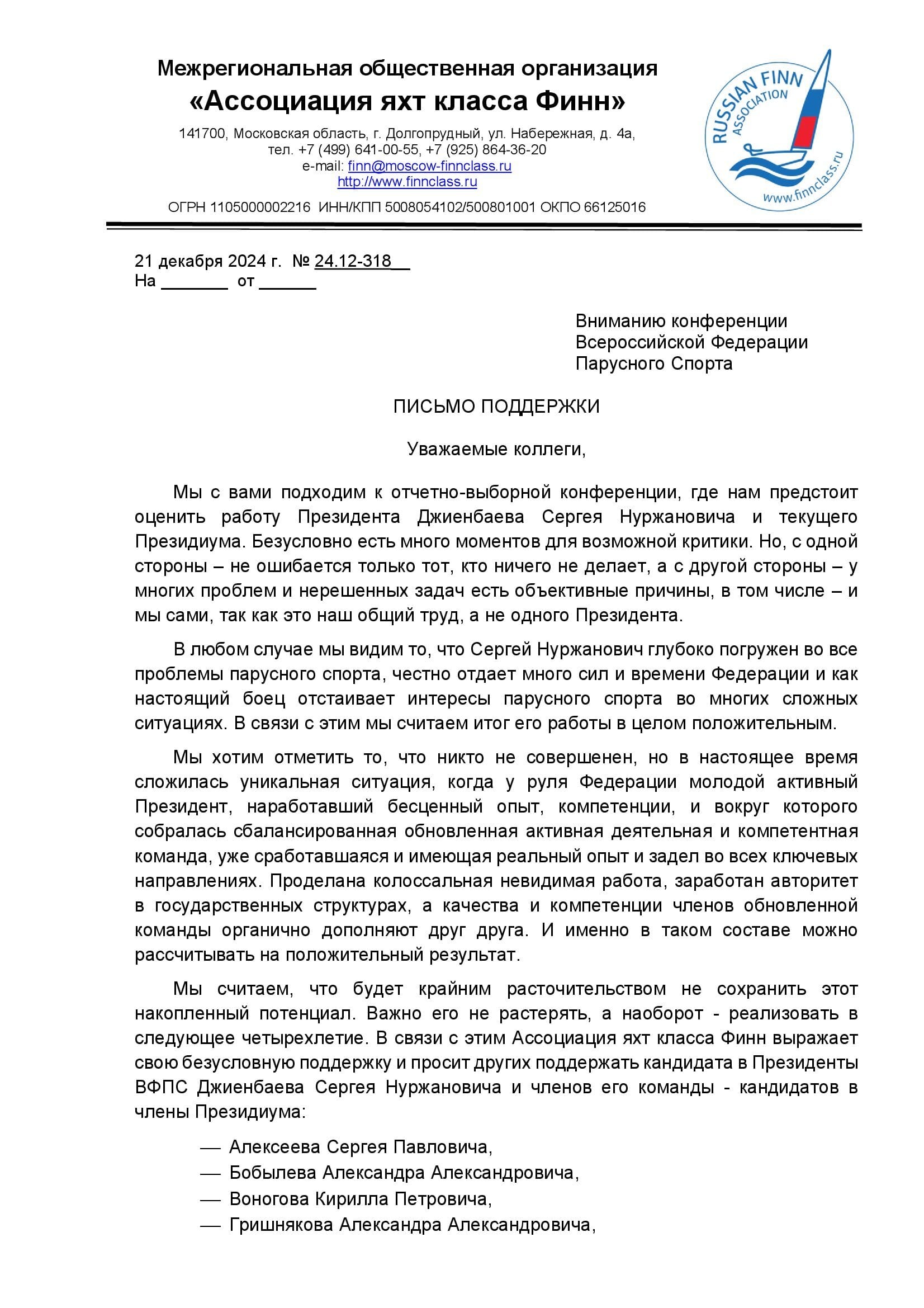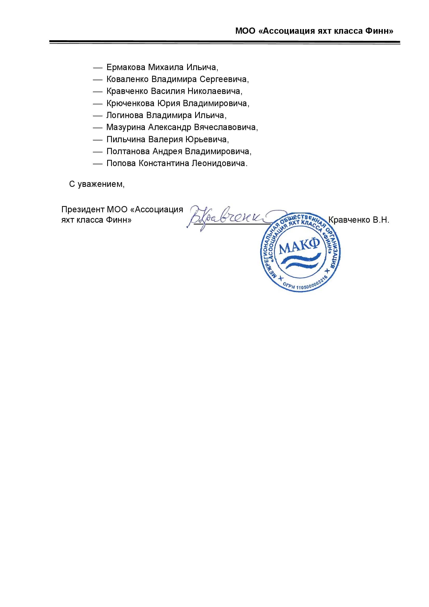 Продолжаем публикацию писем поддержки региональных федераций парусного спорта и ассоциаций, поступивших на имя президента ВФПС Сергея Джиенбаева. Представляем вашему вниманию письма от федераций Мурманской и Ярославской областей, а также от Ассоциации яхт класса Финн.