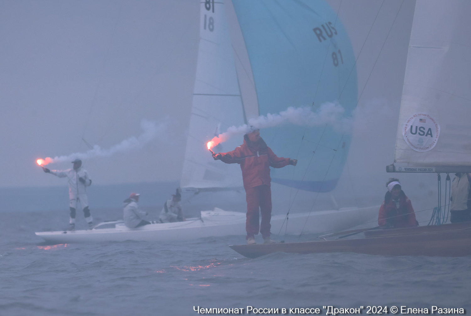«Мы дали короткую гонку в одну петлю, и когда яхты на полном курсе финишировали, они зажигали фальшфейеры, — рассказал главный судья Владимир Комель. — Было много дыма и огня. Почетный финиш самого юбиляра был встречен аплодисментами. Борис Александрович поблагодарил всех за этот удивительный подарок. Было очень душевно и празднично.»